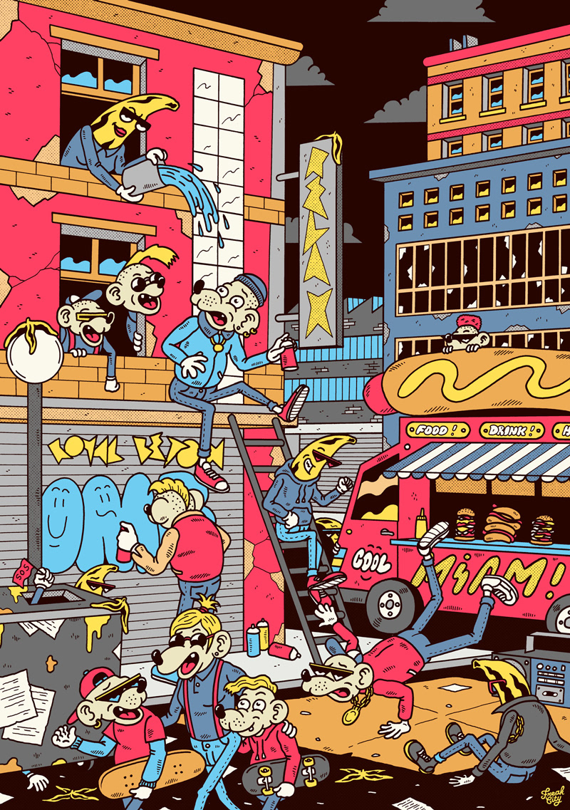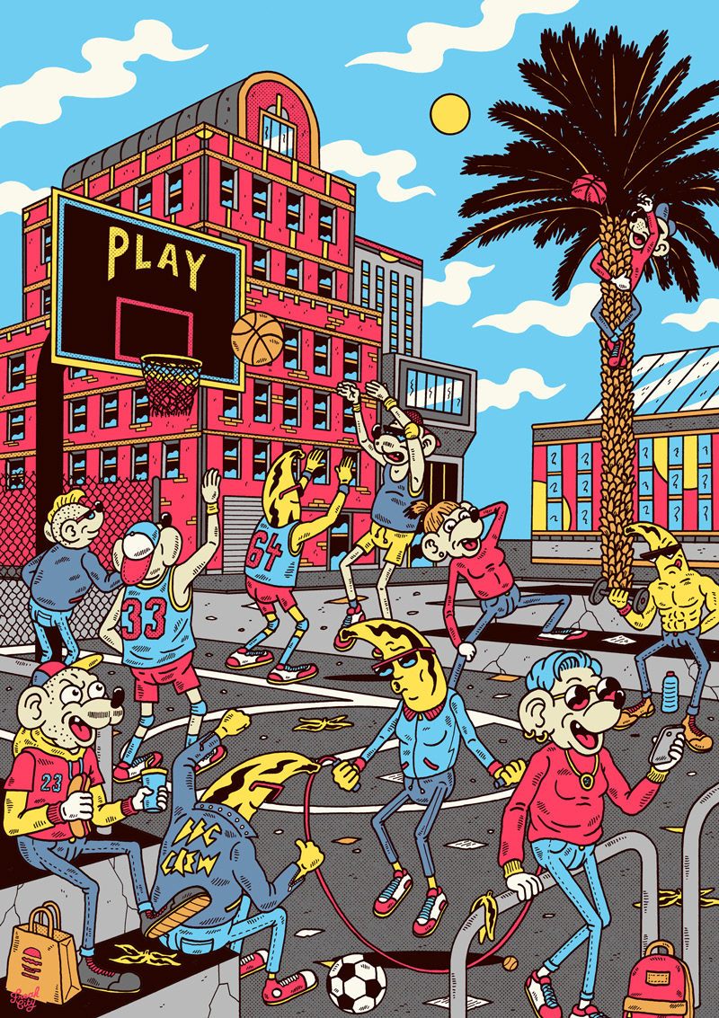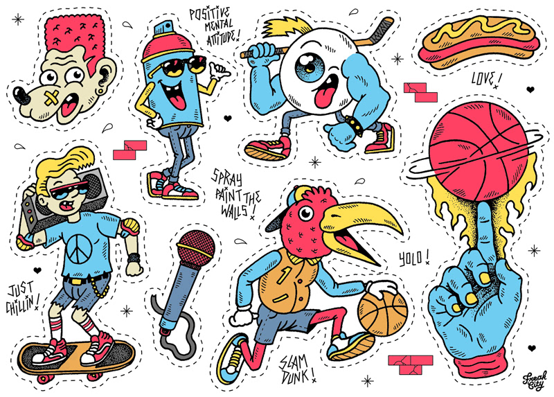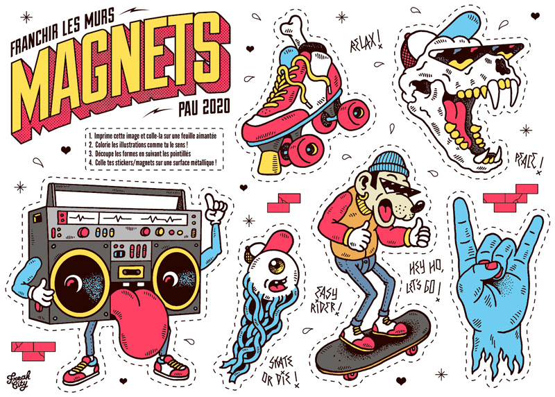 The concept was to draw 2 sheets of stickers, to be colored and cut by kids themselves, as well as 2 full illustrations to be colored too.